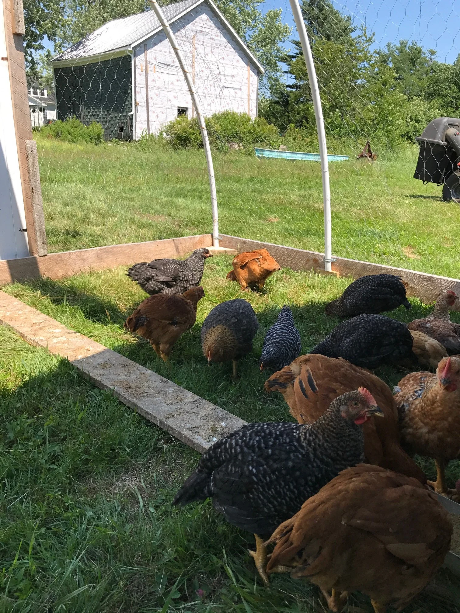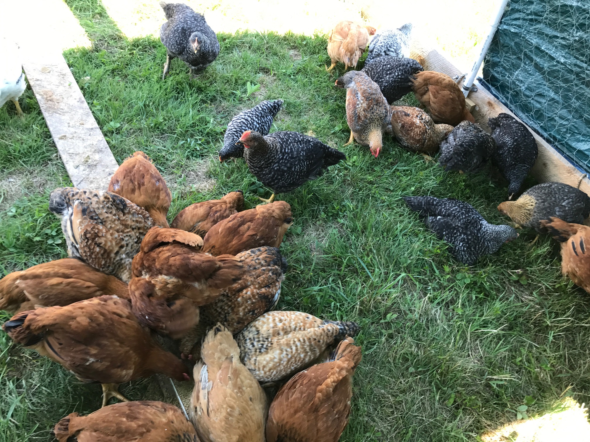 We also raise pastured broiler chickens. They are raised humanely, and spend their days eating all sorts of bugs, grubs, and lots of fresh grass, garden scraps, and grain. Our chickens are processed at a local, State-inspected slaughterhouse and delivered to you vacuum sealed and ready for the freezer.